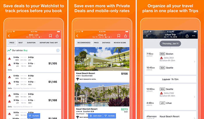 This is a reliable search engine when it comes to travel and holiday destinations. It is a member of the Priceline group together with others like Booking.com and RentalCars. This offers you not only the most comprehensive flight offers and discounts but also other deals. With Kayak on your phone, you have information on airfares, where to stay, rental cars, cruise offers, and vacation packages.